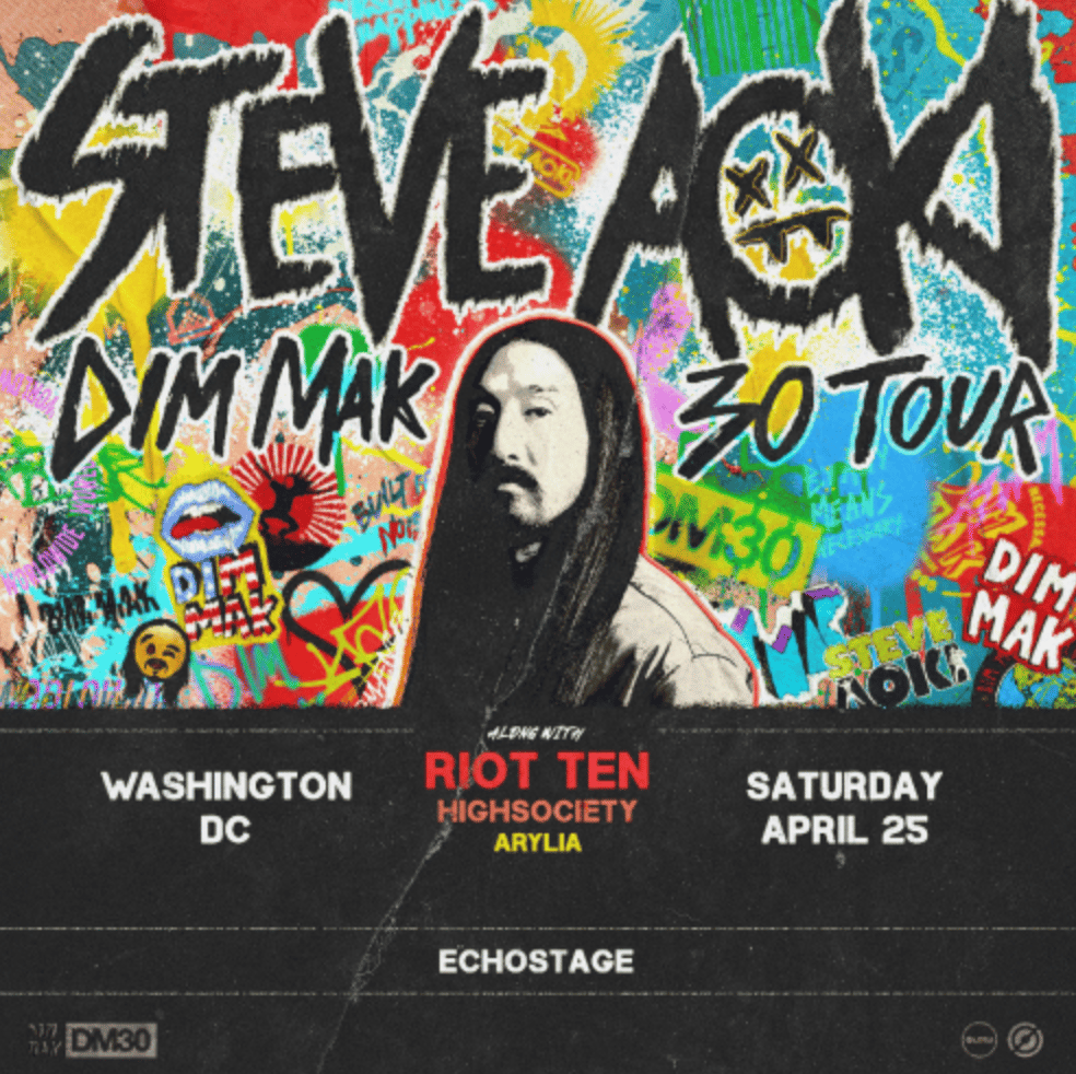 Tip: DIM MAK turns 30 this year. Steve Aoki launched the label in 1996 and has put out records from The Bloody Beetroots, Dillon Francis, Knife Party, and a lot more. Saturday at Echostage is a milestone show, not just a regular booking. If you're going, that context matters.
